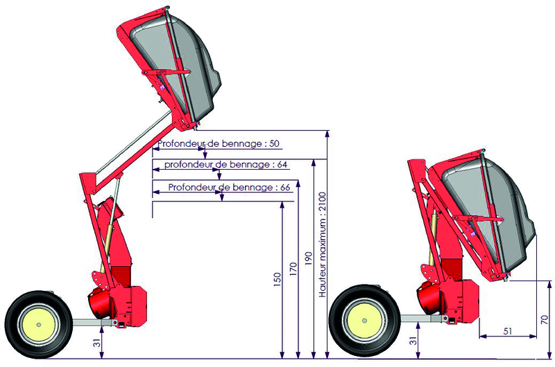 - Vidange du bac jusqu’à 205 cm de hauteur et ouverture de porte hydraulique (nécessite 2 distributeurs double effet)
